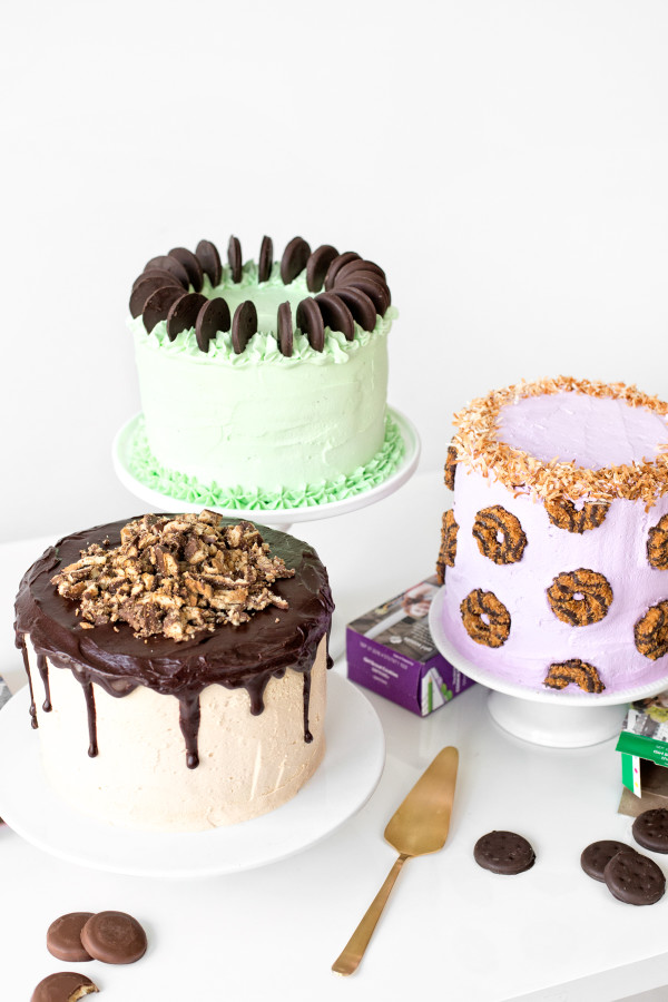 ‘Tis the season!!! If you’ve snagged yourself a couple boxes of Girl Scout Cookies please allow us to bring you… Girl Scout Cookie CAKES! Say whattttt!!!?? We’ve got three of them for you today and each one is not only flavored like the cookies, but they have cookies inside of them AND they are decorated with them too. I MEAN! DREAMS REALLY DO COME TRUE YOU GUYS. Now go hunt down your neighborhood Girl Scouts and get to work!