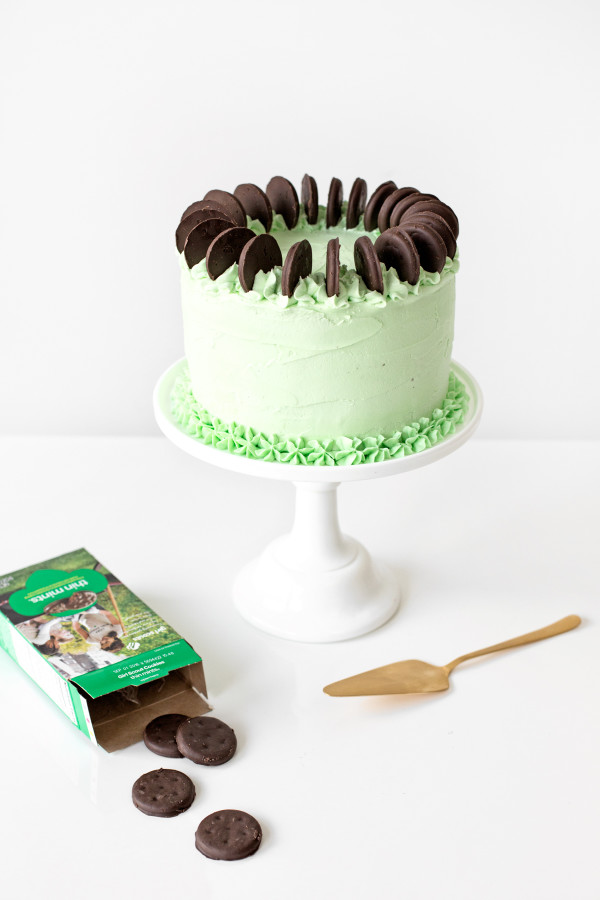 - To assemble: Roughly chop 1 box of Thin Mint cookies. Starting with the first layer of cake, spread about 1/4 cup of frosting across the top. Sprinkle 1/3 of the chopped cookies in the middle of the layer, leaving a 1/2 inch border around the edge. Top with the next layer of cake and repeat this process 1 more time then top with the last layer of cake. Cover the whole cake with the mint frosting. Using a medium star tip, pipe along the top edge of the cake with more mint frosting. Place whole Thin Mints along the edge on top of the piped frosting.