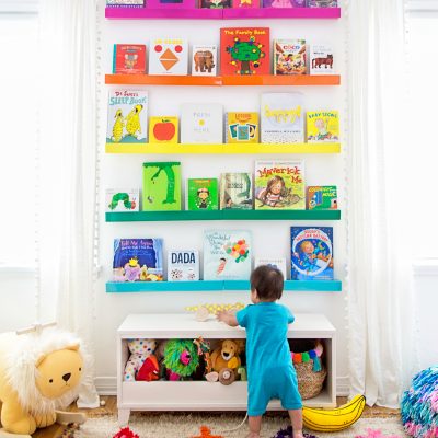 I liked these shelves because they are quite deep and can hold multiple layers of books on the shelves. Our past rainbow shelves, and the current pre-made colorful book ledges on the market (which I linked at the bottom of this post!), are much narrower and generally only allow for one layer of books.
