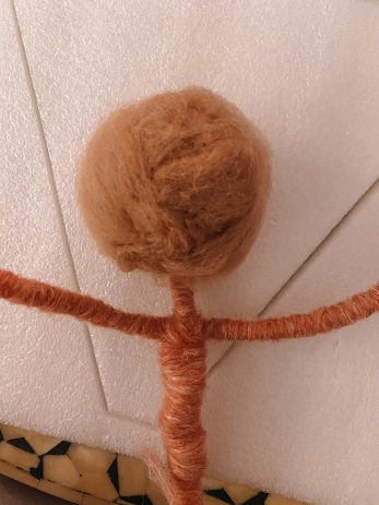 7. Place the knot at the top of the “head” and wrap the roving around the head. Grab a thin strand and wrap that around and around the “neck” of the doll.