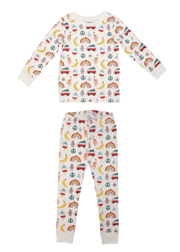 These kids Christmas pajamas have a modern pattern of quirky ornaments, in tons of fun colors!