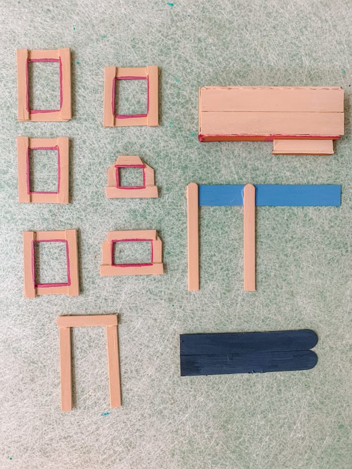 - For the bay window (Make THREE of these): 6 half popsicle sticks, lined up horizontally with space for a window in the middle (see photo), and attached to each other with 2 popsicle sticks glued vertically (one on each side)