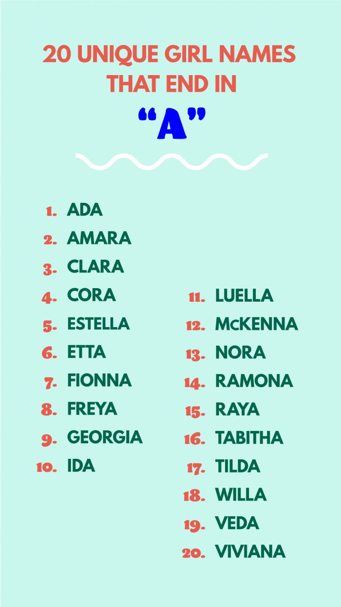 There are, of course, thousands of names that end in “A”, both long and short, new and old, but we tried to pick a handful of unique names that spanned all those categories, plus for one of the submissions we narrowed in on “earthy” and nature inspired names that fit the bill!