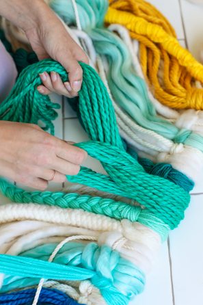 - Single Texture Braid: Cut at least 10-12 strands of a single yarn, at least one and half times the final length you want it to be. Loop the yarn around the dowel as instructed above and then separate the strands into three sections. Braid and end with a knot.