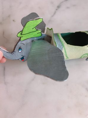 - Five toilet paper rolls, with an oval cut into the top of each (set aside and save for making the Dumbo vehicles below!)